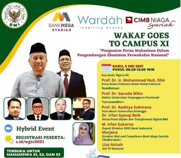 Dalam rangka edukasi & penguatan literasi wakaf produktif, dan pemberdayaan jurnalistik wakaf di kalangan masyarakat kampus (terutama mahasiswa), pers mahasiswa, dan media mainstream, sekaligus perluasan syi’ar wakaf di tengah masyarakat, Badan Wakaf Indonesia (BWI) akan menggelar Program Wakaf Goes To Campus Virtual 2021 dengan kegiatan Seminar Nasional, ”Penguatan Peran Mahasiswa Dalam Pengembangan Ekosistem Perwakafan Nasional”.