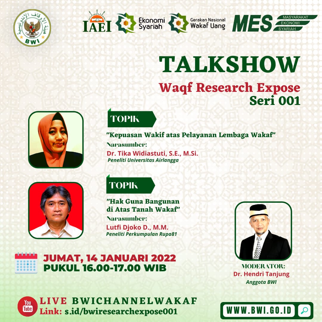 Waqf Research Expose Seri 1 Tahun 2022 Seri 1 akan dilaksanakan pada Jumat, 14 Januari 2022 dan menghadirkan dua orang peneliti wakaf dari Universitas Airlangga dan Peneliti Perkumpulan Rupa 81.