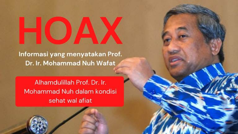 Beredar secara luas sebuah pesan berantai menyebutkan kabar duka meninggalnya Prof. Mohammad NUH, DEA (Mantan Mendiiknas) yang saat ini menjabat Ketua Badan Wakaf meninggal dunia hari ini jam 05.00 pagi di Rumah Sakit Persahabatan adalah HOAX.